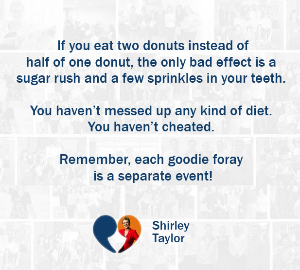 Always remember that even if you think you have completely blown it, you haven’t. If you eat two donuts instead of half of one donut, the only bad effect is a sugar rush and a few sprinkles in your teeth. You haven’t messed up any kind of diet. You haven’t cheated. Remember, each goodie foray is a separate event!